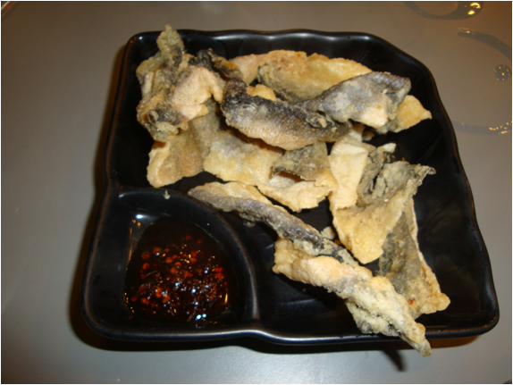 單點一份炸魚皮,店家會附一碗濃郁鮮美的清湯,夾起一片炸魚皮沾點湯汁,脆脆熱熱咬上一口,細細的嚼,時間好像就此凝結,有看過電影裡的慢動作,加上誇張式的神情和短暫停格嗎,我家寶貝真的就是這樣,哇~香氣四溢,滿口芬芳,看著臉頰紅通通的小臉蛋,那份滿足的神情,像是嚐到人間美味一樣,幸福洋溢的孩子真令人喜愛,想起來都快流口水了,真的 讚 讚 讚連3讚,這種炸魚皮和優之良品味道有點不同,優之良品的比較像零食,店裡的比較適合沾湯吃。