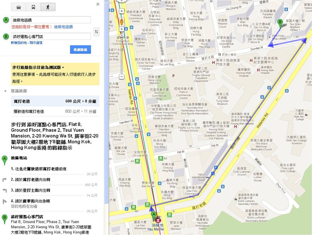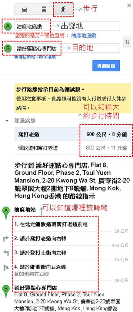 舉例,像油麻地的添好運點心專門店,在巷弄裡非常難找,假如僅依賴旅遊書上的平面地圖,到現場真的會暈掉,循著地址又要沿著路名轉來轉去的找,很不容易,最後一定要問路才找的到,這種找點的經驗大家應該都有過,MM發現只要運用google地圖,先看一下自己前一站所在地,到下一站的距離,通常MM家的都很近,因為都在同一區,再用好到不行的google實景地圖裡,左方的"規劃路線"欄位,KEY入A到B點,就會有路線圖出來,通常不是100%精準,自己要稍微停整一下就可以。