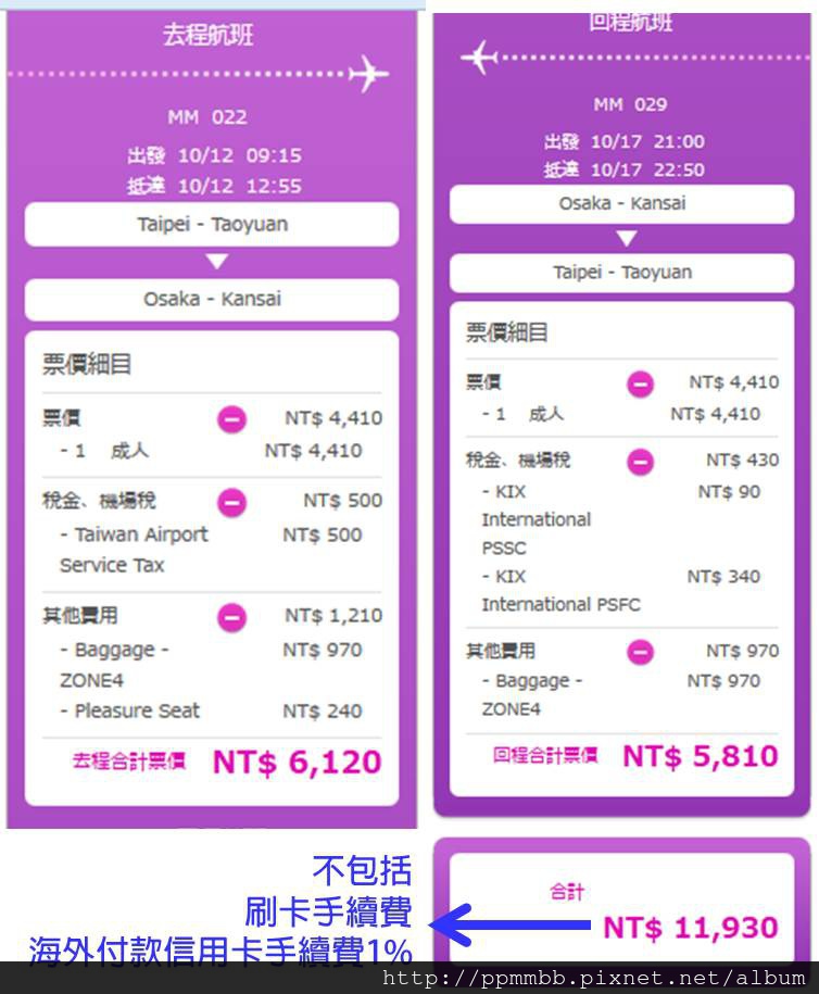 範例(圖2) : 單人來回機票+去程1件行李+選位+回程1件行李=NT$11930,外加,樂桃購票手續費NT$260+信用卡海外刷卡1%之後,總額NT$13393