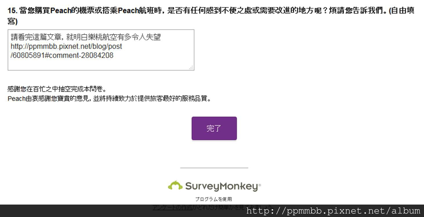 2016.01.15收到樂桃航空電子報會員問券調查表,本人把自己這篇文章網址附上去,讓樂桃航空自己看看多讓人失望,有麼多破壞日系長久累積給人優良服務的美好感覺。