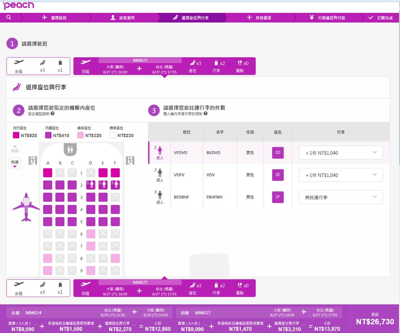 Peach 2016改版後的網頁,廉價航空競爭越來越激烈,Peach機票價格比去年便宜,2016.08.20-27早去晚回機票,3成人機票+來回選位+去程1件行李+回程2件行李總計NT$26730(未含手續費&信用卡海外刷卡費),平均1人機票9千多,和我2015年暑價購買的機票1人NT$12350便宜好多