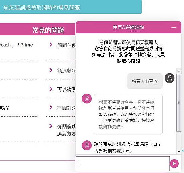 若不想和AI問答,急著轉人工客服,直接打字" 機票人名更改",聊天機器人無法處理,會出現"請問有幫助到您嗎? 只要點選底下出現的"否",就會直接轉接線上客服,不用和機器人制式問答了