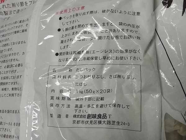 ODA創味鰹魚湯包業務用,1包50gx20袋=1000g誠意十足的大分量, 驚人的業務用份量1000g售價¥880,價格真是迷人,我換到的匯率0.2788,¥880=NT$245,換算每g=NT$0.246元,好市多賣的三幸鰹魚粉售價高於創味大約7倍,我知道煎魚等級價差非常大,或許是因為鰹魚使用等級不同,習慣使用鰹魚湯包的我,覺得創味鰹魚湯包成分比較簡單,味道感覺也不錯,2款價差實在太過懸殊,習慣用鰹魚湯包的朋友,可以將好市多賣的第一超市三幸和創味這2款產品比較看看,用了創味鰹魚湯包後,台灣分裝的"特選和風鰹魚高湯包"就沒再買了