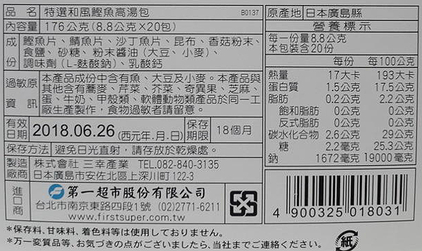 好市多賣的這款"特選和風鰹魚高湯包",進口商第一超市,製造商日本三幸似乎只是原料商,提供鰹節本枯鰹節、鯖節枯鯖節、椎茸宮崎県産香信椎茸、うるめ鰯熊本県産うるめ鰯、北海道利尻昆布,這5樣原料,當時買這款因為在好市多試喝過好幾月喝感覺越好喝,使用也方便,雖然有點貴,那是因為日本三幸的產品都很貴 看日本三幸原裝產品點我,三幸網站自己賣的產品原料都很單純,回家後仔細看了包裝,有標示台灣分裝,所以紙盒包裝正面、背面、說明書都看不到三幸品牌LOGO,不是原裝,成分中有添加砂糖、食鹽、粉末醬油、調味劑等,添加那麼多種,這樣就感覺頗貴的,1包8.8g、1盒20包=總共176g,NT$319,換算每g=NT$1.8元