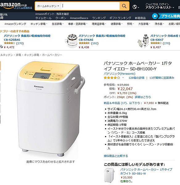 Panasonic SD-BH1000的升級版現在是這台,パナソニック ホームベーカリー 1斤タイプ イエロー SD-BH1000-Y ,amazon.co.jp価格¥22,047,查日本買麵包機價格點我
