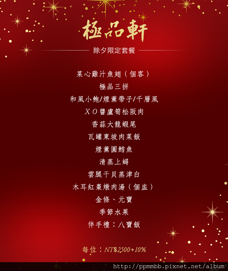 除夕套餐每位2500,外加10%,極品軒的上海菜口味滿好,只是過年難免會吃很多餐大魚大肉,除夕吃上海菜稍嫌油膩了點,店員比較散漫,爬文看到有人除夕太早訂位被忽略,我自己是沒遇到過,若有訂位,務必再三確認