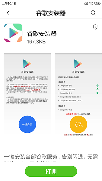 現在台灣區和大陸區,在哪區購買只能在哪裡維修,實在太不友善了,不過比較進步的是"MI應用商店"和"Google Play"redmi 7已經同時並存,一開機就能使用,Note 4以下版本,只要上"MI應用商店"搜尋"谷哥安裝器",點"打開","安裝"
