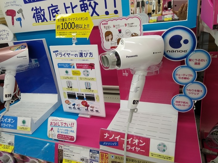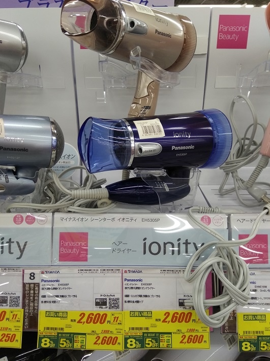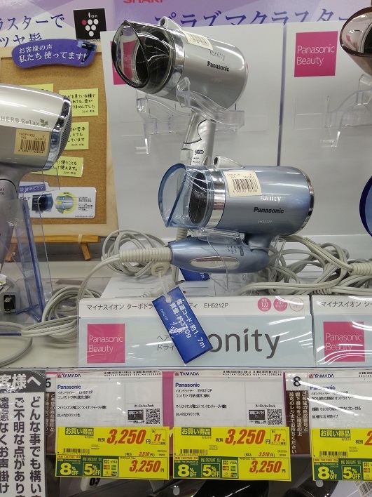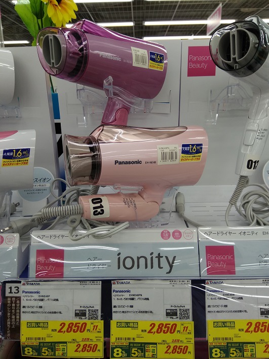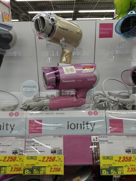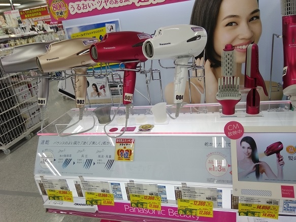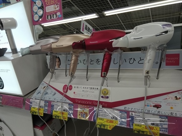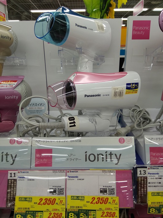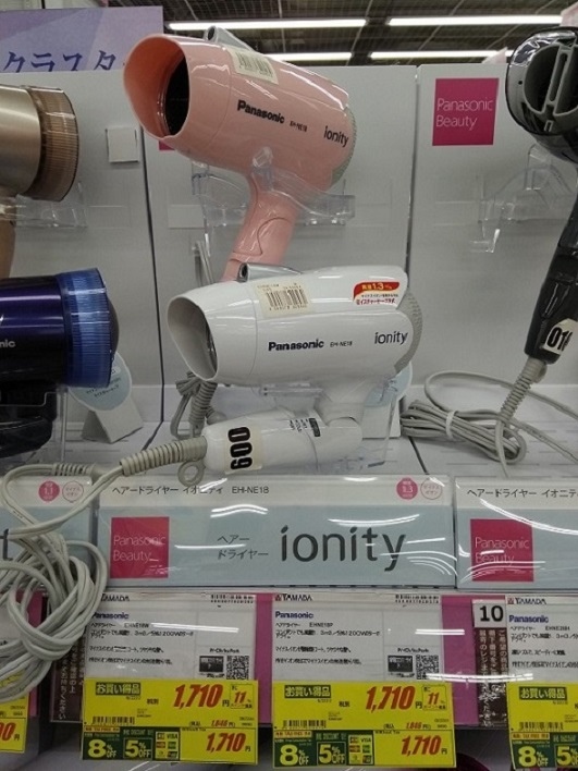 這次是來選吹風機的,第1天全部拍起來慢慢研究,第3天才購買,Panasonic BH-NE系列負離子大風量防靜電吹風機,日本飯店幾乎都選用這系列,因為速乾、省電,試過N款後,感覺都很速乾,最新款標榜的功能,短時間使用時感覺沒有非常大的差別,可能要長期使用才能感覺得出來其中的變化,讓孩子帶到學校用,以我家寶貝的隨和性格,應該會成為同學們公用機,選了Panasonic BH-NE18,1710日幣這款,經濟實惠到可以多買1支備用,以免被用壞自己沒得用,免稅8%,再折扣7%=85折,1454日幣(匯率0.2782=405台幣),這款台灣網拍價差很大890元-1560元,Panasonic吹風機更新速度超快,除非有特殊需求,選基本款一般家庭用效果滿足夠的。