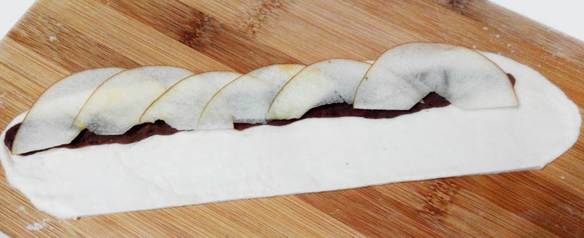 5.將豆沙餡壓扁,鋪上蘋果片
