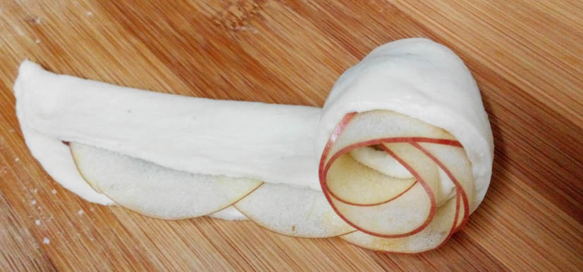 6.鋪好蘋果片,下邊的麵皮往上折