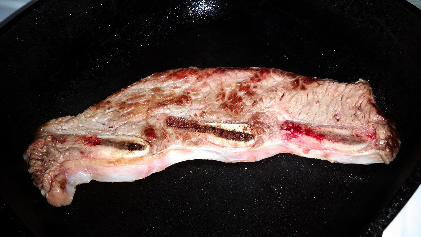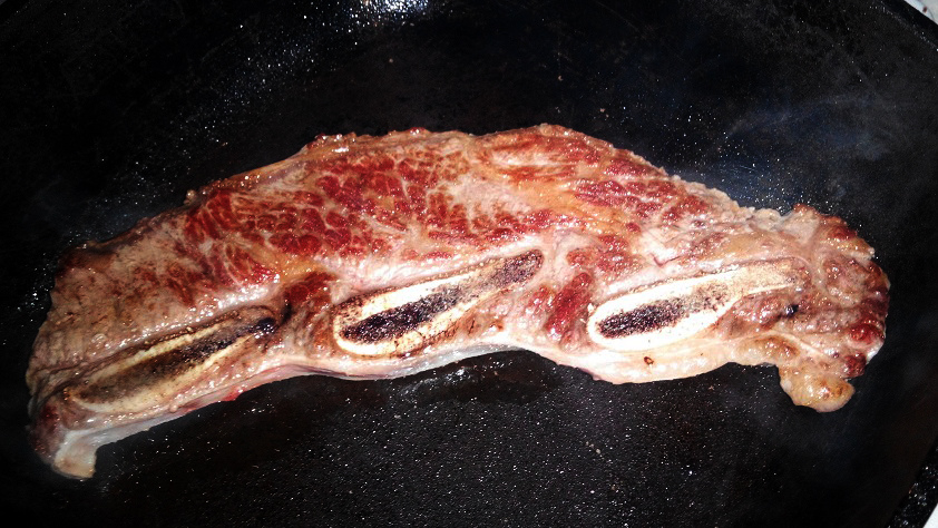 1.開大火,不須放油,放入帶骨牛小排,煎20-30秒