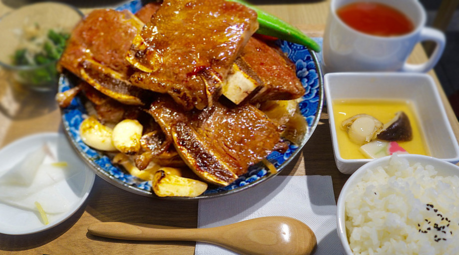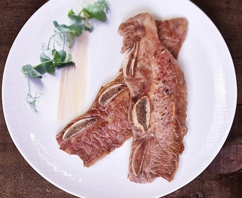 大廚教的極簡擺盤,用烤肉刷沾點醬油,在白盤上刷一筆,上面放點豆苗+2塊帶骨牛小排