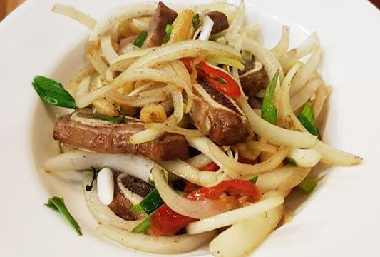 煎牛排所出的油,直接煎洋蔥絲,洋蔥絲再和牛排塊拌在一起,簡單好吃的偷懶方法,剩下的油,炒任何菜都會又油又香