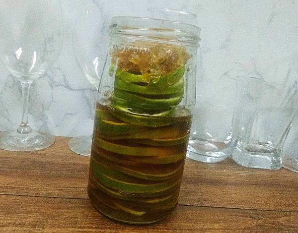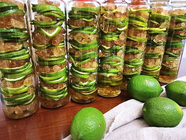 蜜漬檸檬,使用美國黃檸檬和台灣綠檸檬相較,香氣和味道黃檸檬絕對勝出;夏季天熱,一杯冰涼的蜜漬檸檬,消暑解渴,趁初夏,不妨多做幾罐,好處多多的蜜漬檸檬,蜜漬2個月的綠檸檬,苦澀味還是有的,我常用30cc蜜漬水+300cc冷開水+4顆冰塊+新鮮薄荷葉,帶點苦味喝起來滿解暑的感覺;蜜漬綠檸檬片打綜合果汁時加一片,香氣更豐富非常好喝。