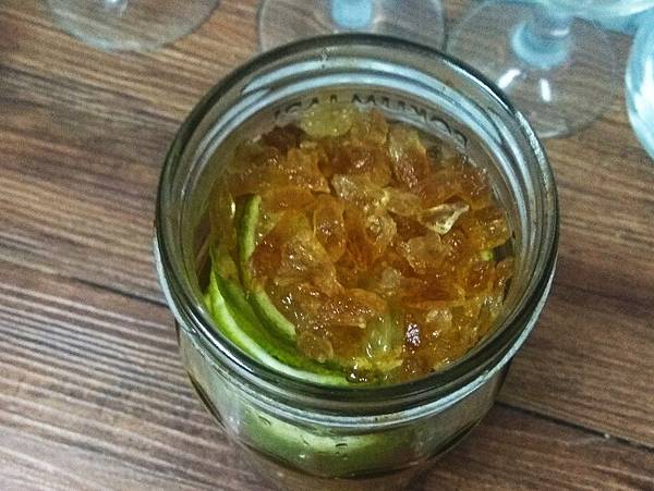 1.萊姆切片,水1 : 糖2,糖溶解後將萊姆片放進鍋中