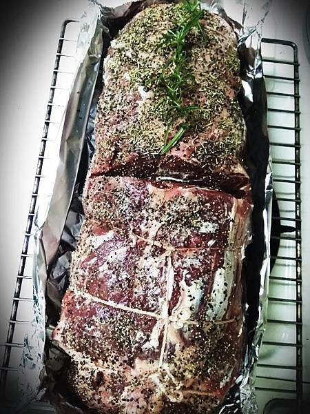 4. 用料理繩把肉綁好固定成漂亮的圓柱型,繩子間距約3CM,烤架上鋪一塊鋁箔放上肉塊肉的周圍鋁箔要折成船形避免烤的時候肉汁溢出,也可以直接放入烤盤烘烤