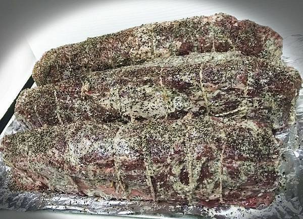 寶貝高中時期,為了幫準備學測中的孩子們打氣,我們導師邀請4組家長認養班上同學的宵夜,愛心滿滿的我,義不容辭+熱情響應,想著能為孩子準備些什麼才能更具激勵效果,在教室吃烤牛肉應該滿特別,所以當天早上好市多開始營業就直奔肉品區,運氣很好的選到3包筋膜少油脂也少的3條7.5公斤牛肉,不專業的家政婦第一次烤如此大量牛肉,其實心裡還滿忐忑的