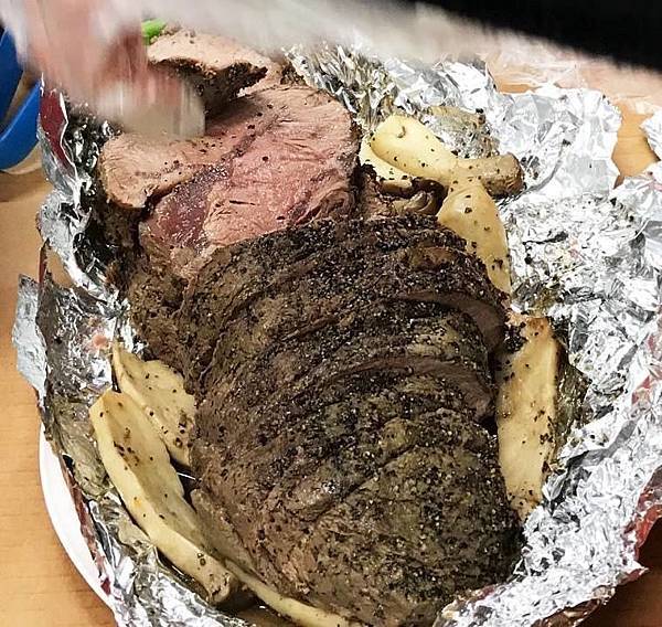 一烤好,阿拿達和我抱著1大箱牛肉、2大箱100%純果汁,開了單趟40幾公里來回80幾公里的車程,"溫熱"送到學校+現切服務,因為人多沒有時間炙燒,所以肉塊外圍10分熟,中心大約烤成6分熟左右,這樣的熟度才不會有的同學不敢吃,6分熟3條牛肉,每條牛肉都用3層厚錫箔裹起來保溫,也讓剛烤好肉再次熟成,開車40分鐘到校後,打開錫箔,就會是剛好溫熱的7分熟,烤牛肉緒溫力實在不錯,30多位同學+7-8位老師,現切現吃
