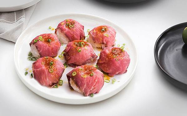 我家有位還在發育的寶貝,三不五時會突然肚子餓,這時候的烤牛肉就能派上用場,薄切做成壽司飯糰,沒什麼脂肪,可以快速完成,適合當無預警的充飢料理