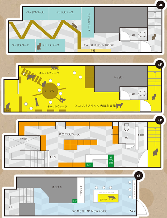 這是一家頗具規模的保護貓咪店,只要和貓一起來玩就等於在支援保護貓咪。為了保護貓咪,這裡設施將5層樓建築物整個改裝,3樓貓咪咖啡廳。一邊是可以和可愛貓咪一起玩耍的空間,一邊是貓咪認養。其他樓層,可以和貓咪一起午睡+販賣和貓咪有關的雜貨,每個樓層有不同的和貓相遇方式,地下鐵心齋橋站走路8分鐘。