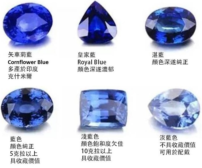 皇家藍和矢車菊藍是藍寶石的兩種頂級顏色,皇家藍顏色濃郁深沉,其純正藍色肉眼觀察更為透徹;矢車菊藍則帶有絲絨感,火彩均勻更明亮柔和,矢車菊藍最初特指產自克什米爾的一種藍寶石(已瀕臨絕跡),現在則是達到一定級別的顏色即可稱矢車菊藍,這是大家所熟悉的藍寶石。