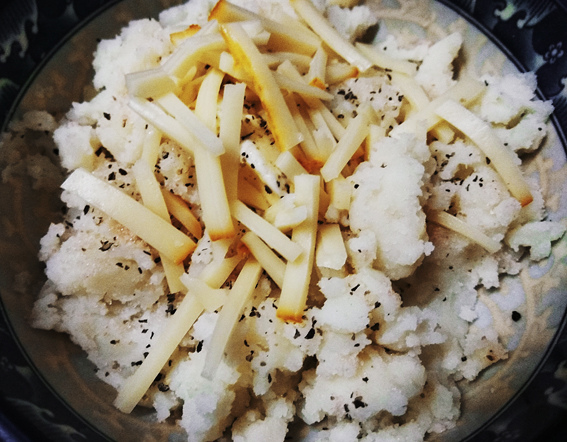 5.培根切碎煎香+挖出來的薯泥+玫瑰鹽+奶油+粗胡椒粒+莫恩斯特乾酪(用剪刀可以輕鬆剪成絲狀)拌勻,拌的時候空氣會進到料中,烤好後口感比較鬆軟