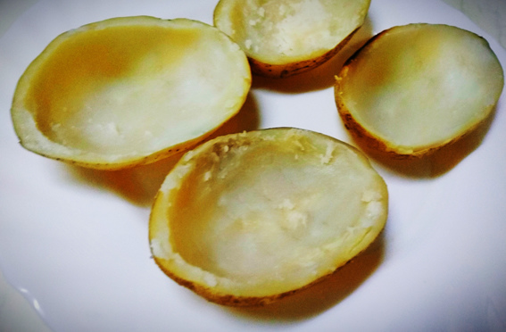 4.將馬鈴薯泥全刮出來,留0.3公分厚的薯皮帶薯肉的馬鈴薯碗