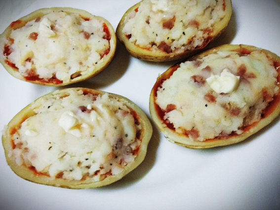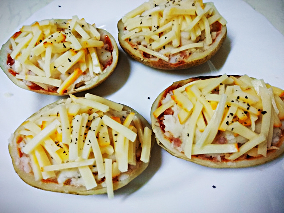 7.把料裝回塗上番茄醬的馬鈴薯碗,料 別壓太實,盡 量保持鬆軟,壓太實烤起來會比較濕口感就會有點打折扣