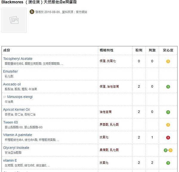 成分中的牛油果Avocado oil: 肌膚調理劑,油脂含不飽和脂肪酸,植物甾醇、維他命A、E,具保濕、修護功能,對肌膚有柔軟作用保持彈性,易氧化變質應儘早用完;含有脂肪伴隨物質及棕櫚油烯酸,具良好延展及吸收性,能鎖住肌膚水份並活化防禦組織,抑制發炎,這個成分對於油性膚質可能引發青春痘