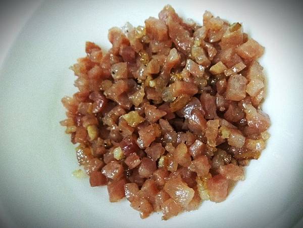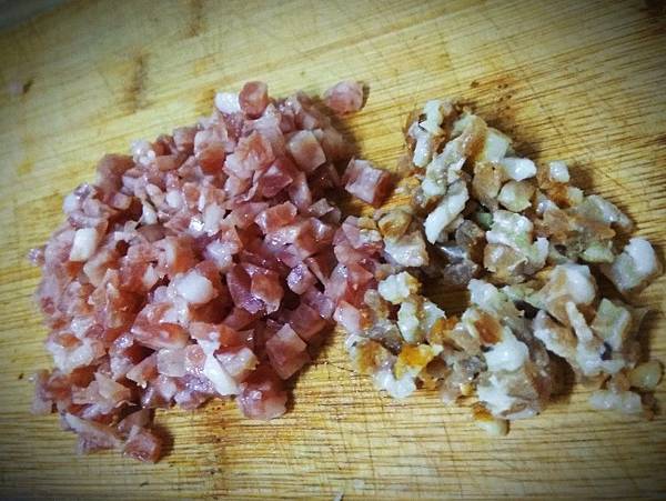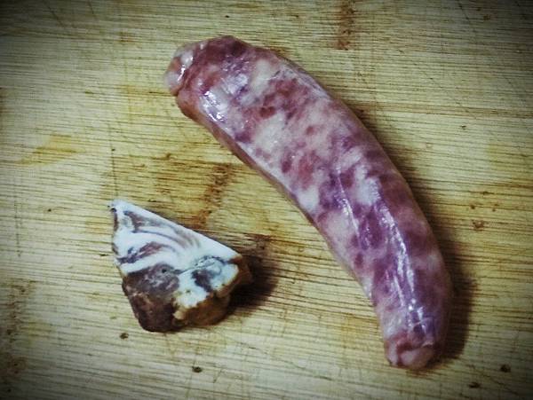 2.臘腸切小丁,放入滾水中燙約1分鐘,撈起瀝乾水份備用(若用台式香腸此步驟省略),這次用台式香腸,所以加了一小塊婆婆的DIY臘肉增加香氣