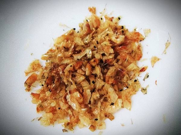 4.蝦米洗淨瀝乾水,放鍋中不放油乾炒至水份收乾,不巧蝦米用光,櫻花蝦切小丁取代,香氣還是很夠