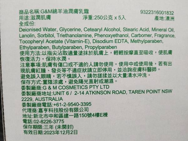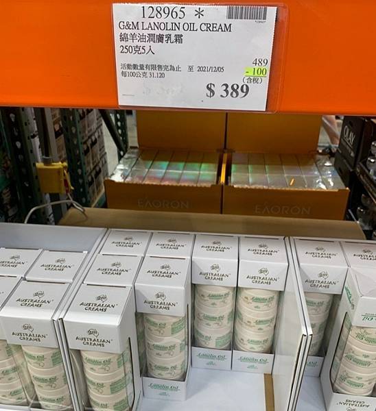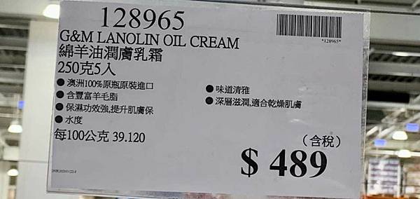 另一款,味道和妮維雅很像的澳洲原裝進口G&M 綿羊油潤膚乳霜 lanolin oil cream ,250g x5入 ,$489,平均1罐不到100元,每100公克$39.12
