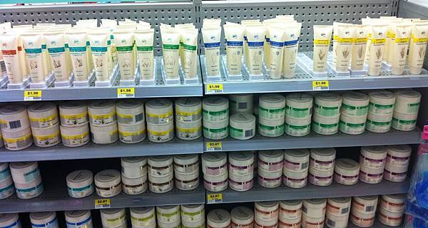 賣場同時陳列白瓶和黃瓶,黃色深層滋潤有香味,白色有修護功能無味