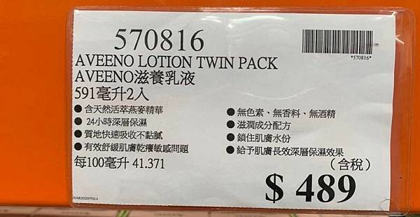 Aveeno 滋養乳液 591毫升 X 2入,$498,每100公克$42.132