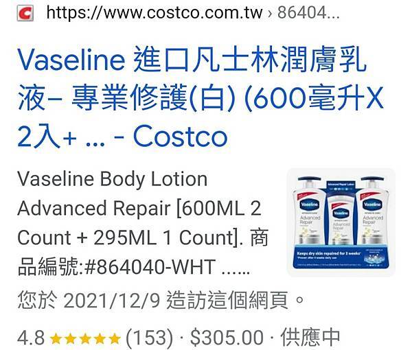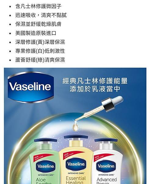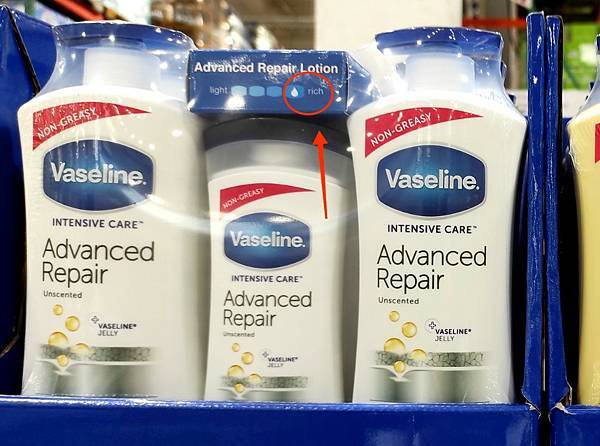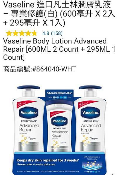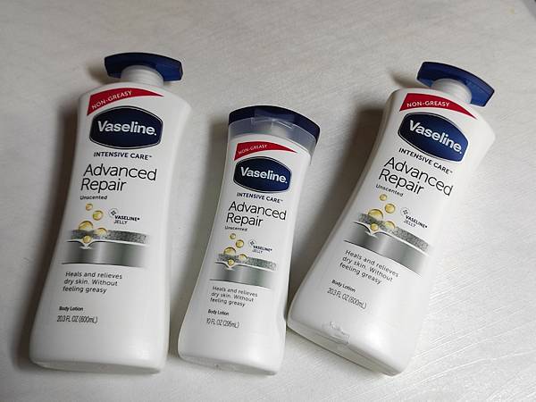 好市多還有一款好用的平價極滋潤產品Vaseline Advanced Repair Body Lotion 可滋潤修復頑固乾燥肌膚,高效鎖水保濕乳液(白瓶) ,無香精高效鎖水保濕,特乾肌膚用!