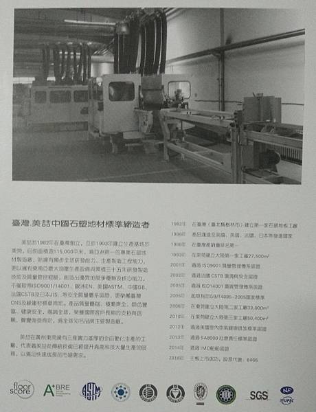 這款沐石系列石塑地板,能看到、摸到板材,也能看到數片板材放在一起的感覺,防潮、防蟲、零甲醛,老闆說彈性不錯,鋪微斜坡沒問題,連浴室地板、浴室牆面面都能鋪(背後需要額外加膠和釘牆,廁浴室天花板不行),擁有這款石塑地板的公司,生產品項很多,有銘木地板、硫化銅門、各類實木地板、防火矽酸鈣板、海島型地板、百利防水板、石鐵門、實木門、實木地板 防燄超耐磨地板、綠建材地板、水叮噹地板、石塑地板、優森活 F1無毒地板,品項不少,石塑地板是後來增加的項目,大陸進制造掛品牌。