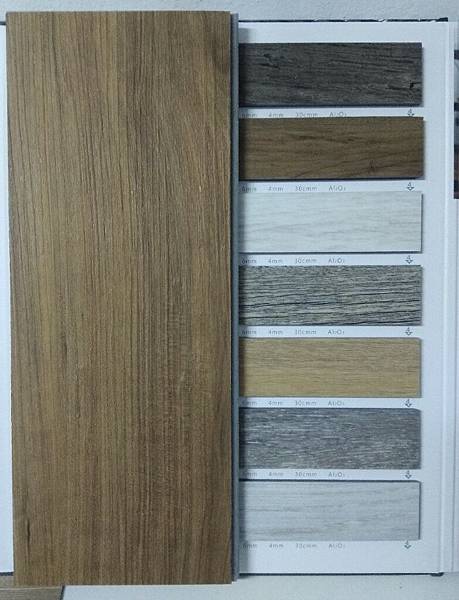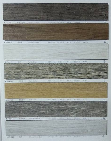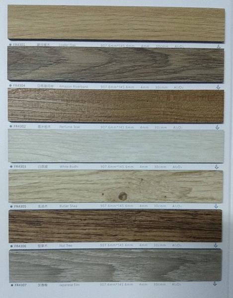 當時覺得6萬轉讓我很心動,不過老闆告訴我看僅看幾萬轉其實不是很準確,這說法打破我的認知,他說還要參考石粉和PVC的比例,並非石粉含量越高越耐磨,板材尺寸越大地面平整度要求要更高,像我家這種老宅歷經各種大小地震加上長年熱脹冷縮,地面看似平整卻無法像新屋那般水平,板材大不見得是優點,這款老闆自有品牌和我原來鋪的價位相同,耐磨度確更高一些,老闆自有品牌,型錄有這幾種顏色