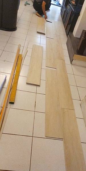 老闆帶來的幫手,這收邊~ 真是讓人欲哭無淚,若是用封邊條的人應該不怎麼在意,我不用封邊條,邊緣一定要平整,看到這樣的品質讓我在內心不斷祈禱老闆的朋友鋪設速度能盡量緩慢點,多留一點面積讓老闆施工,老闆技術優於老闆娘,老闆娘技術優於老闆的朋友,有鋪設技術比較後才知鋪石塑地板看似簡單,動手後還真有點難,中間部分基本上只要力氣夠大應該能安裝緊密,收邊處DIY就不一定能做得好,老宅房子地坪通常都不是垂直線,會傾斜,老闆的朋友在切SPC時都是只抓板材的水平,不管交接面,而且沒有一片切成標準直角,所以每片卡上去後看起來一定是斜的,若對品質在意,一定要確認有能力完美收邊再自己DIY舖SPC地板,否則邊緣應該會比這樣更慘不忍睹