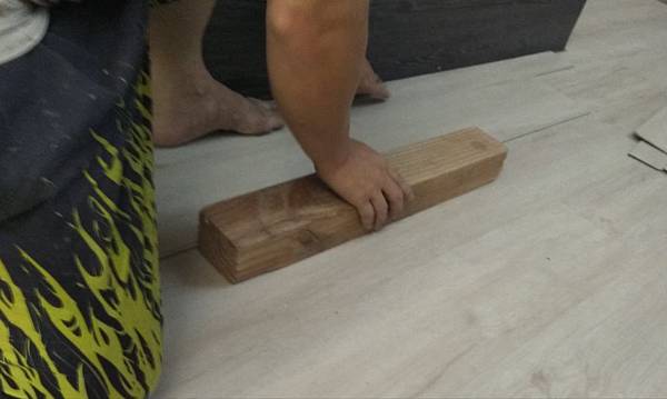 這種雙卡扣施工真的比拍拍扣要費工一點,需要這種輔助工具將地板長邊推和敲緊密