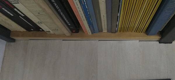 我可憐的書櫃,可惜第一次施工時鋪的機近完美,如今... 咳,原來不只是珠寶放在一起比較立見層色、閃度的優劣落差,施工技術亦是如此,一比之下施工品質立見高低,雖然板材免費,但是這施工品質實在不專業,鋪地板找個人工作室的問題就在於此,除了老闆自己技術還不錯,臨時幫工和徒弟的技術實在不穩定