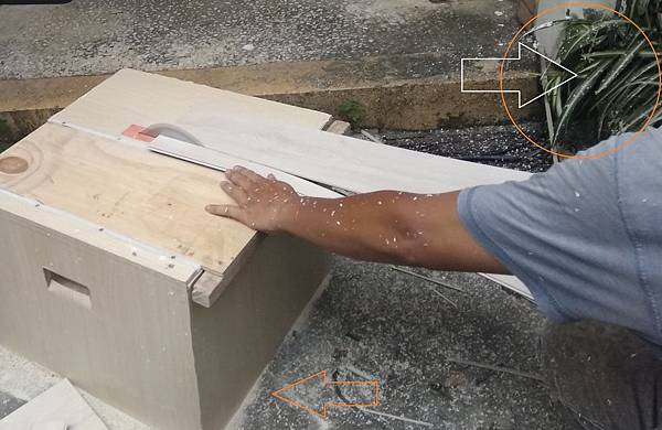 老闆自製切割機,雖然看起來有點陽春,不過切石塑板挺好用的感覺, 雖然有集塵袋,但切割時板削會從切刀週邊四散飛濺,因為集塵效果不怎麼好,後來老闆將集塵袋拆了