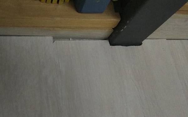 多處卡扣交接出現下圖這樣的線狀高低差大約0.05-0.1CM,腳踏時不太有感覺,但若在地板弄濕後灰塵又累積上去時,灰塵會卡在裡面,尤其廚房,油炸料理時的油多少都會飛濺在地上,即使像我選則淺色,這時候也不用太擔心,立刻用濕抹布與地板卡扣線平行擦,再順著地板垂直紋路擦,很容易擦乾淨,千萬別與有高低差的卡扣線垂直擦,這樣會將灰塵卡進凹凸處而擦不乾淨,這種深紋的石塑地板,因為紋路深,容易積灰塵,乾的狀態下清掃時,要和紋路平行掃,表面能掃乾淨,若用掃地機器人,那就沒這些需注意的地方,全交給掃地機即可