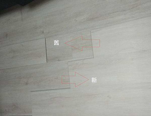 這是第一層的石塑板,凹凸紋看起來比較明顯,但塑膠味較重,光感、表面滑順度較第二次鋪的高,也較第二次的不易卡塵,SPC珍吊放在一起比較才知優劣