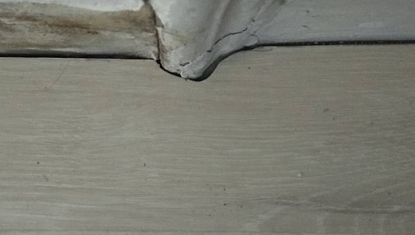 7月確認重鋪,剛好遇上老闆喜獲麟兒,直到10月重新舖地板,老闆建議將原來地板當成防潮墊直接往上鋪一層會更平整,微斜坡的廚房地面,SPC底下就不需要用矽利康加強固定,等待換新地板期間,8月時家裡廚房地板縫突然不時微微滲一點點水,感覺怎麼擦都擦不乾,擦乾了又會有微微水滲出來,不停除溼過了2周左右微微濕的狀況才消失,只是縫隙中多了很多垢,石塑地板理論上是不會發生這種狀況,後來才想到廚房石塑地板下有一個排水口,鋪石塑地板當天老闆娘很忙所以讓我自己封住,應該是技術不好沒有完全封死,期間正巧下了一場豪大雨,水溝的水就從排水口溢上來,果然當初補做時的廢料擔憂不幸發生了,SPC沒有卡扣就失去最大優點密合性