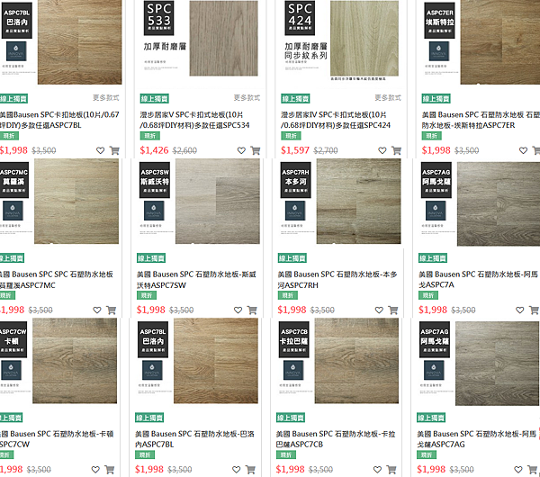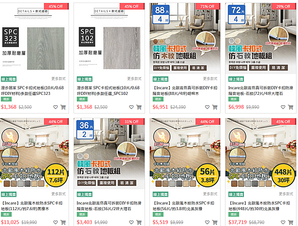 網購石塑板選擇性較多,但大多是買空賣空,只提供樣品沒有實物,訂購後再幫你叫貨,價位從$1440-4600,1箱0.6坪,缺點是樣品都好小看不到整快板材,只能看型錄氣氛圖,圖片就是會有色差,較難判斷,其中這款石塑地板