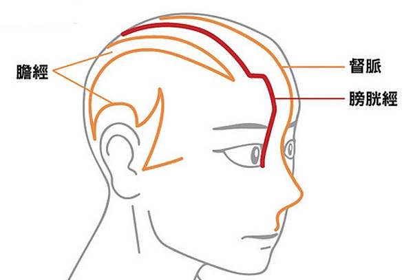 除頭部膀胱經外,臉部也有膀胱經通過,從內側眼角睛明穴向上連至頭頂膀胱經。