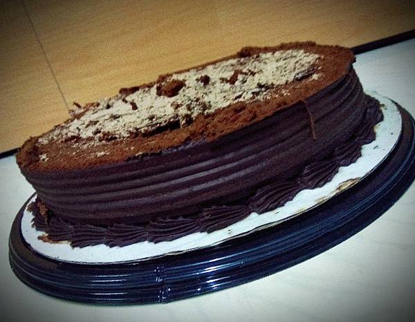 我還試過把一個蛋糕橫切成2個蛋糕(不習慣橫切大蛋糕的,可以用很細又堅固的縫衣線取代刀子),一個蛋糕就變成單層奶油巧克力餡料的蛋糕體上,層蛋糕有巧克力醬本身就有裝飾,稍微加工就能好看+好吃