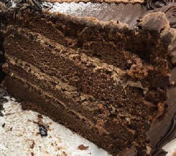 蛋糕體超厚,中間很大方的夾了兩層奶油巧克力餡,這部分就是吃起來偏甜的來源