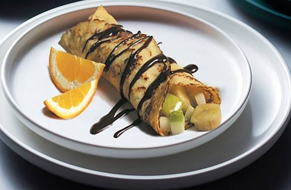 水果捲,做法,麵皮煎一下 → 表面加點優格 → 放水果丁 → 捲起來 → 上面擠點比利時巧克力醬