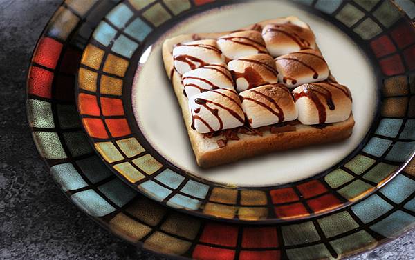 棉花糖吐司,給寶貝的不敗點心,看起來美味又香噴噴,作法:吐司烤酥後,鋪點巧克力削+棉花糖,炙燒棉花糖表面+比利時巧克力醬